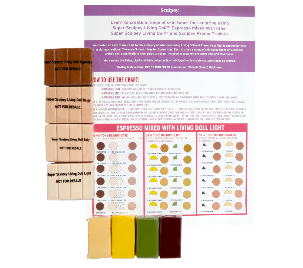 Used by professional clayers, doll-makers and film studios worldwide, Super Sculpey® Living Doll™ clay can help anyone create authentic figurines with realistic, fine features. This set is perfect for sculpting classes or for artists that want to experiment with creating a range of skin tones for their dolls/figures. Includes a color mixing chart based on a makeup artist's skin classifications from pales to cacao.