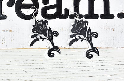 Layer the Black lace pieces on top of the White. Thread an open jump ring through a hole at the top of both the Black and the White pieces. Repeat for the other set. Attach the ear wires to the open jump rings. Close the jump rings with pliers.