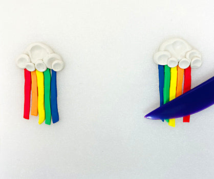 Start with clean hands, unwrap and knead clay until soft and smooth, or condition by running clay though a Pasta Machine. We recommend using a designated machine for clay purposes only. When working with multiple colors, clean hands with soap and water or baby wipes (we have found that baby wipes work best) before switching colors. Shape clay, pressing pieces firmly together. Wash hands