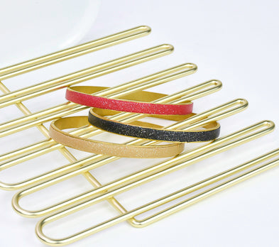 Repeat for the other two blended colors – mixing both the Cherry Pie and Latte in 1:1 mixes with the Yellow Gold Glitter. Bake according to the directions in Step 1. Once the bracelets are cooled – they are ready to go – no glue needed! I choose not to glaze these because I liked the contrast between the Premo glitter and the matte surfaces of the Souffle clay.