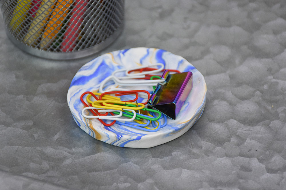 Please make sure your work area is covered and you are not working on an unprotected surface. We recommend working on the Sculpey® Oven Safe Work Mat, wax paper, metal baking sheet, or disposable foil. Uncured clay may damage unprotected furniture or finished surfaces. Be sure to cover your crafting area appropriately.