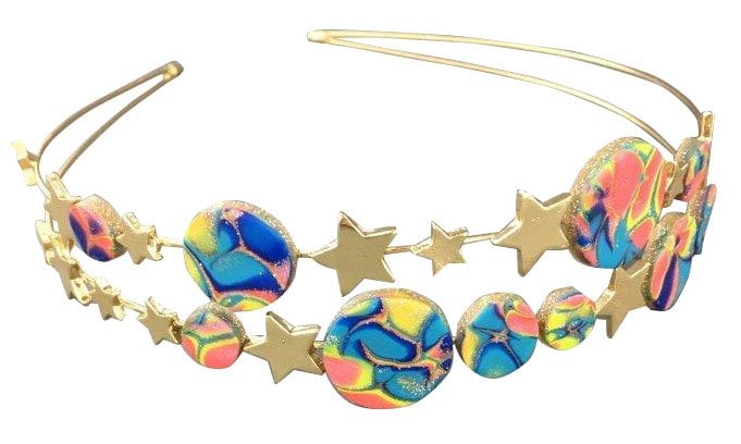 Place an index card down on the work surface. Pick up a couple of the cut circles of clay and place them pattern side down onto the index card. Pick up the headband and pick a spot between two stars. Hold the headband over the different size circles until you find a size that looks either good or, in the case of stars that are close together, will fit in the gap. Once you know which circle you would like to use position the headband over the chosen circle and line the wire of the headband up over the center of the circle. Slowly press the wire of the headband down into the clay. Continue slowly pressing down until the wire is buried just below the surface of the clay; leave the clay on the headband. Continue the process of adding circles of clay onto the headband until you have added as many clay pieces as you like. Once you are finished adding clay, place an index card onto the baking dish and place the headband face down onto the index card. Bake the clay/headband assembly according to the directions in step 1 and let cool completely.