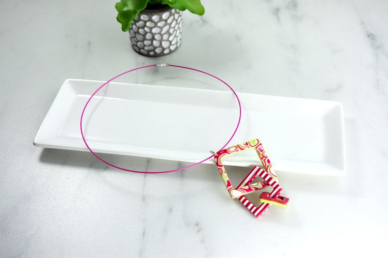 Bake the 3 squares according to the directions in step one. Once the clay has cooled, use the Super Slicer to cut one of the corners open on the middle square. Thread the smaller square into this square and finally thread it through the largest square. Use the super glue to glue the square back together. Add a jump ring through the hole at the top of the largest square and hand your new pendant!