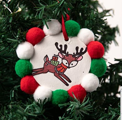 Use hot glue in a glue gun to attach the pom poms around the outside edge of the ornament. When the glue is completely cool, thread the ribbon through the hole, tie a knot, and trim with scissors.