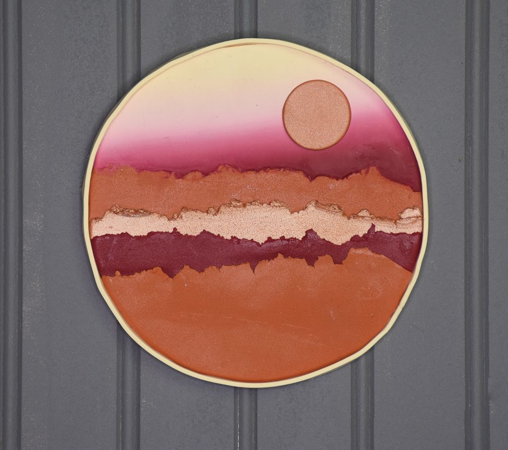 Mix equal parts Copper and Terra Cotta clay. Roll to make a sheet and use circle cutter to cut circle. Place in upper right quadrant of circle just above the Cabernet/Light Pink blend.