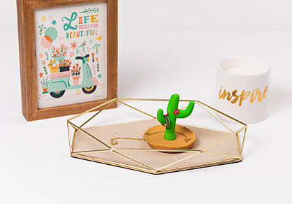 Press five petals in clusters for each flower using the pointed rubber tipped tool. Add the centers and poke a hole in each one with the 2 mm ball tool. Bake the little cactus following the baking instructions for Sculpey® III. Wad up some pieces of paper towel to use as supports under each arm while baking. Allow to cool completely before handling.