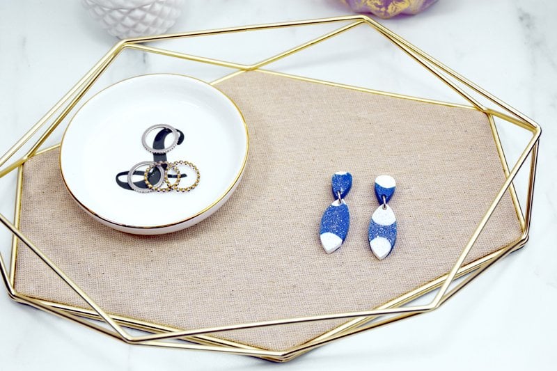 How to make the blue modern earrings: Follow the direction of the red earrings, just using blue and white instead of red and black liquid clay. The liquid white clay is often very viscose and so it presses the blue clay further to the middle. Don’t drag the white clay into the blue and use silver for the acrylic paint splatters!