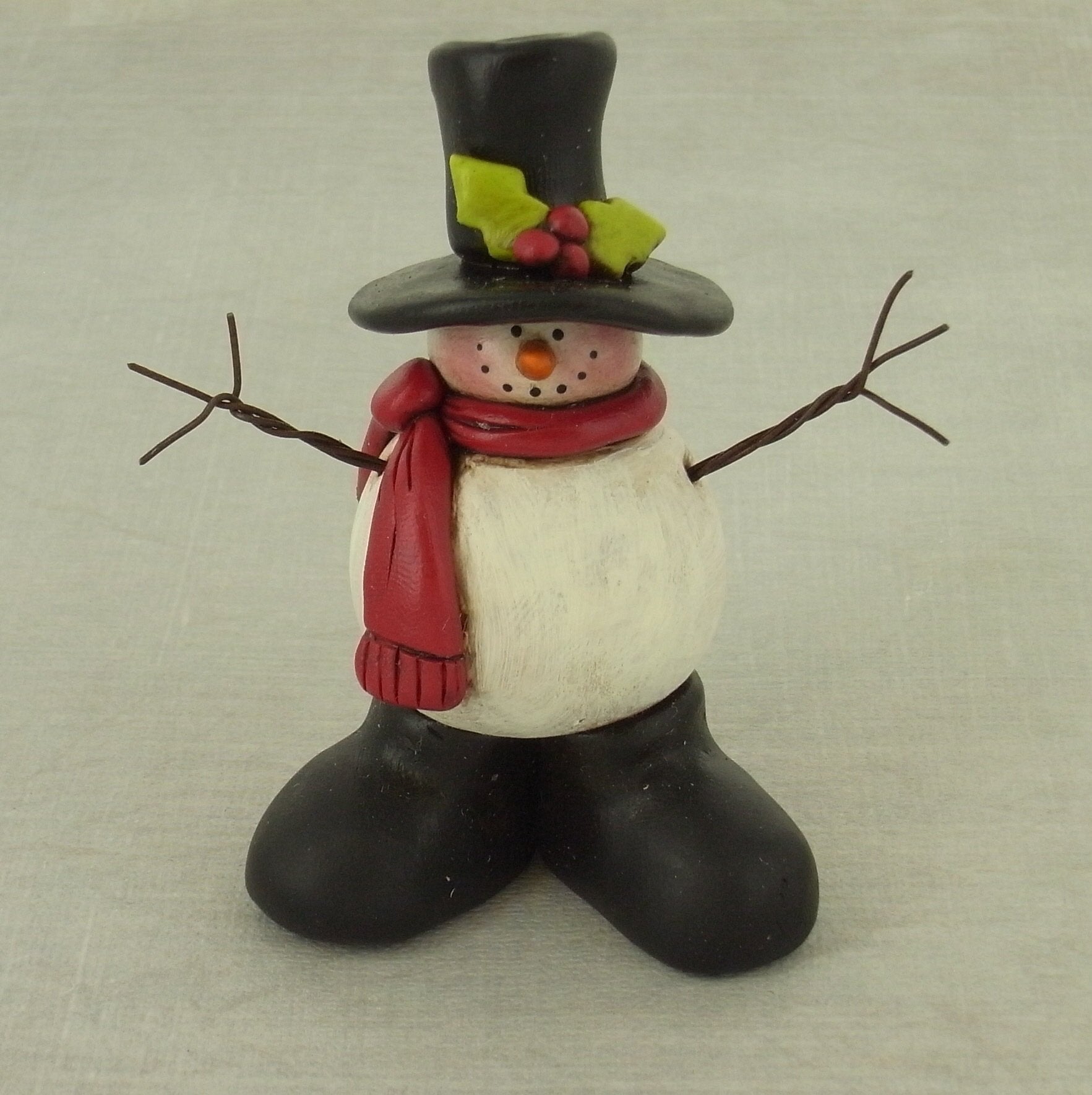 Make 2 small holly leaves out of the Wasabi clay. Make a carrot with the Orange clay about 1/4" long. Using the Red clay, make the scarf and 3 small berries.