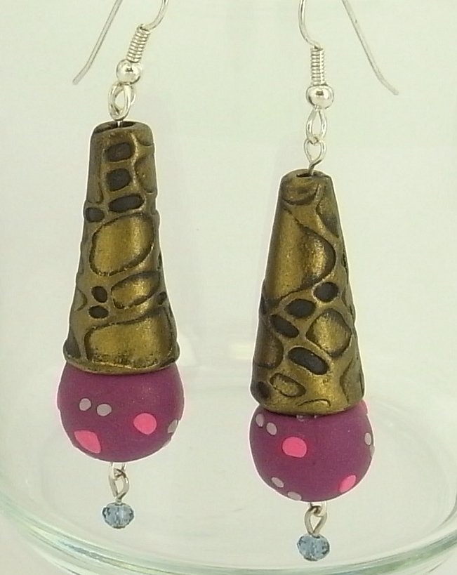 Use new Sculpey Soufflé clay for these fun, lightweight earrings. Start with a funky texture and black and gild it with mica powder to simulate a metal cone. Bright, fun colors complete the look.