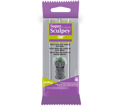 Super Sculpey® Firm is the answer to many sculptors' desire for a clay they can carve, tool and detail with none of the blurring and bending found in softer polymer clays. This firm polymer clay is gray in color, making it easy for both sculptors and photographers to see even the tiniest detail and, when necessary, catch it on film. After curing in the oven, Super Sculpey® Firm can be sanded, drilled, carved and painted with water-based acrylic paint.