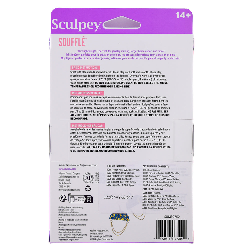 - Sculpey Soufflé™: This clay holds shape during modeling, is easy to condition and will not crack or break when baking large pieces. Adult crafters, sculptors and artists prize Sculpey Soufflé™ as it is lightweight and perfect for jewelry making.