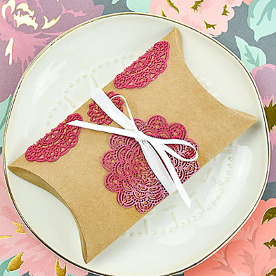To make this unique polymer clay favor box, you will need a 1-ounce bottle of Liquid Sculpey® Garnet Metallic, a beautifully designed mold, ribbon, white glue and a kraft favor box.