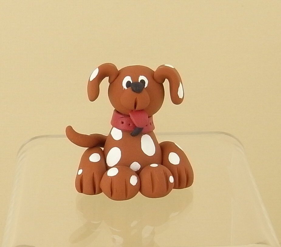 Terra cotta: Take 3/8 and shape into a teardrop for the body, shape 1/8 into two clubs for legs. Take3/16 and make a ball for the head. Take 1/8 and shape into two balls for the front paws, 1/16, shaped into two flattened ovals for the ears, one small ball for the muzzle, one long thin snake for the tail, one tiny triangle for the nose, one flattened strip and one very short snake for the collar and one very small flat oval for the tongue.