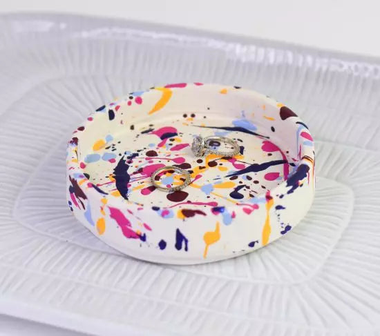 Now we will splatter paint the dish. For my dish I am using acrylic paints in either glossy or enamel finishes. I love the way the glossy paint contrasts to the flatness of the Original White Sculpey®. Stir each color of paint well and then see how quickly it drips from your stir stick.You will want your paints to be fairly fast moving and not clumpy at all. A good way to thin acrylic paints is with Floating Medium. You can add just a few drops at a time to the paint and stir it in completely before testing again for runny-ness.