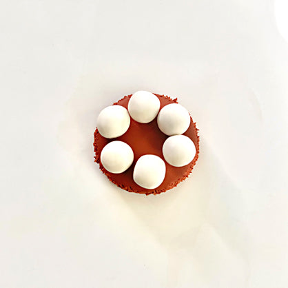 Roll 12 small balls of white clay to create the filling for the cake. Arrange 6 balls on the first layer as shown in the photo. Slightly press a layer of terra cotta clay over