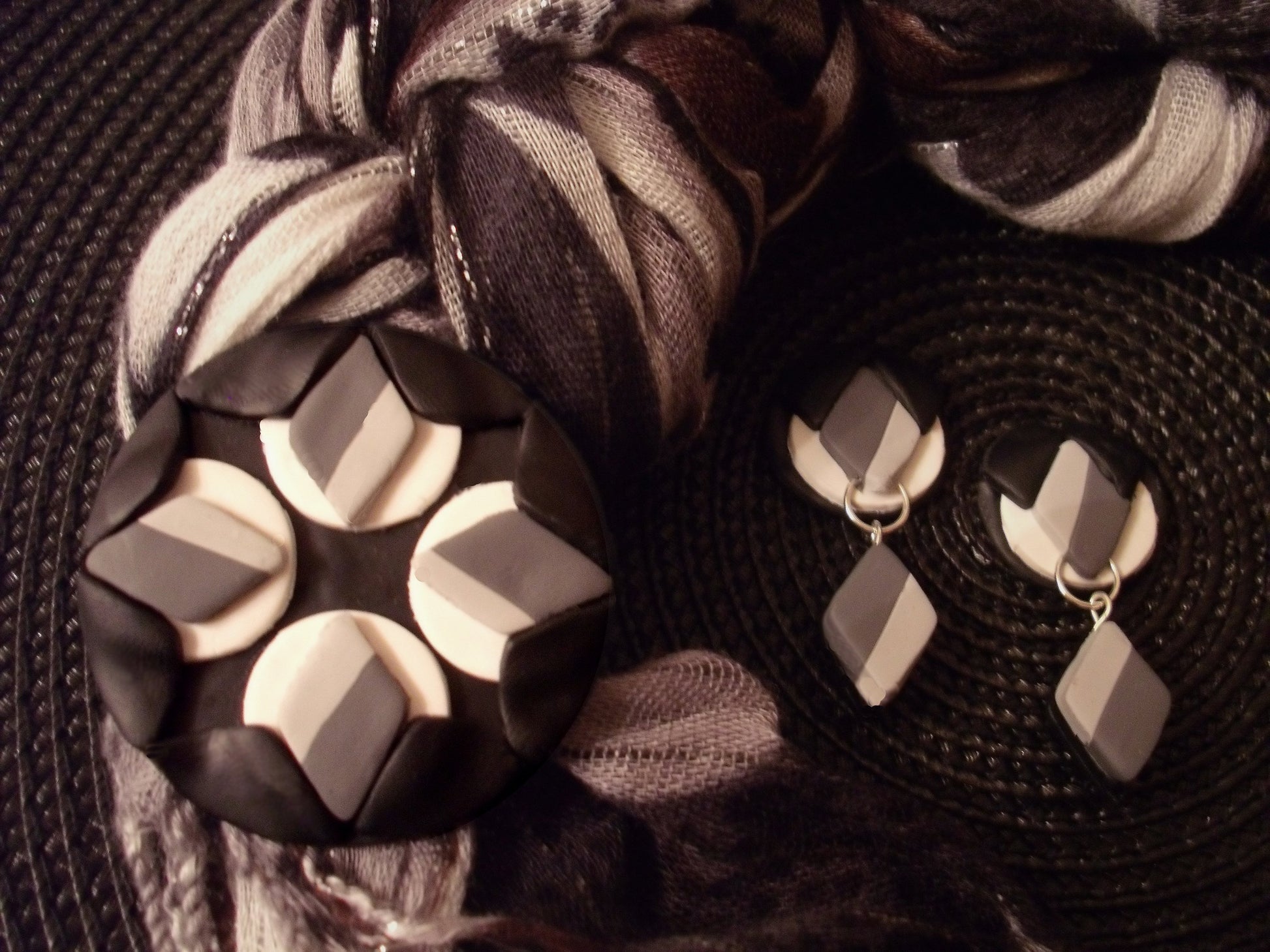 Flatten a sheet of White clay to #4 and cut out six of the smallest circles. Center and secure a two-toned Gray diamond shape on each circle (bottom left of photo). Now secure four White circles evenly spaced on the Black clay base. Make sure to place them so the light Gray strip is facing the same direction on all diamonds and the circle edge is right up to the large black base edge. For the earrings, add Gray diamonds to the remaining White circles and set aside for now. Secure a Black diamond up against a two tones Gray diamond as shown, all the way around the pendant (angle is sown in the top right corner of the photo). Now use the same largest circle cutter to cut out the same size circle once again to trim off the excess lack diamond shapes (shown with a dotted white line).step 7