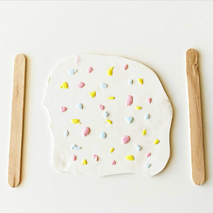 Mix bits of colors together to make pastel pink, blue, and yellow. Red + White = Pastel Pink, Blue + White = Light Blue, Yellow + White = Pale Yellow. Tare off small parts of each color and randomly place them across the sheet of clay and slightly flatten them with an acrylic roller.