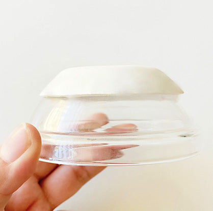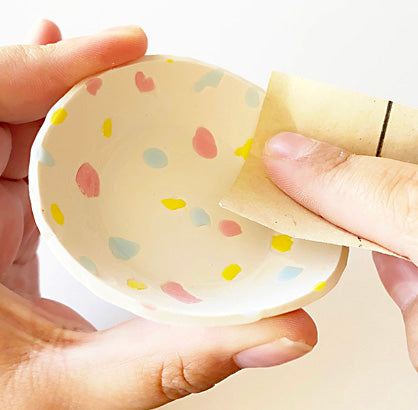 After cooling, sand the inside of the dish if there is an impurity that you’d like to smooth out as well as any uneven edges of the dish. Finish the dish with glaze.