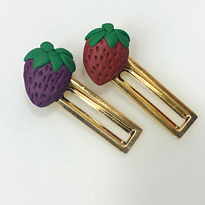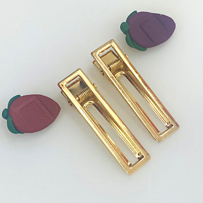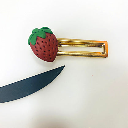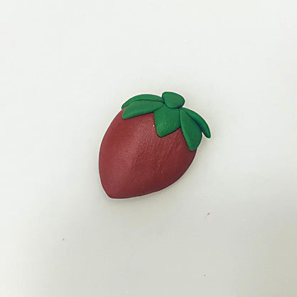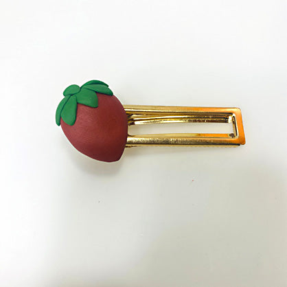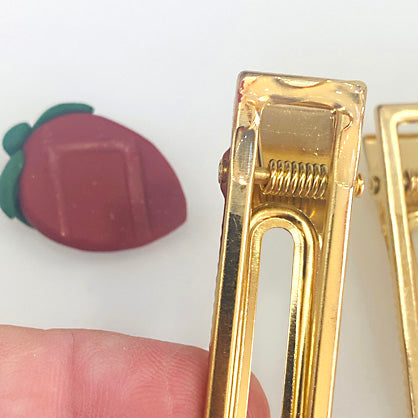 To make the strawberry sit well on the hair clip, gently press the strawberry into position where you want it to sit when finished. Since my clip has the open area, I want the strawberry to take on that shape exactly, so I applied enough pressure to the clay to help it sit and take on that shape.