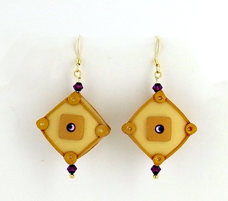 Roll out a thin sheet of Gold clay and cut out eight 1/8†circles. Pick up one circle and place it so it is centered over the corner of one of the beads. Gently press it around the corner so it conforms to the 90 degree bend. Repeat this on the other three corners. Pick up your needle tool and poke a small hole into the top of one of the corners, this mark gives a place to start drilling the small hole later. Turn the bead 180 degrees and poke another small hole so that the earring will hang on a diagonal. Repeat this process with the second bead, place them both onto the fiberfill, bake for 15 minutes, and let cool completely. Once the beads have cooled use the small pin drill to drill holes, this doesn’t require much work since the clay will drill quite easily. Once you have drilled the holes check to make sure they are the correct size by inserting a headpin