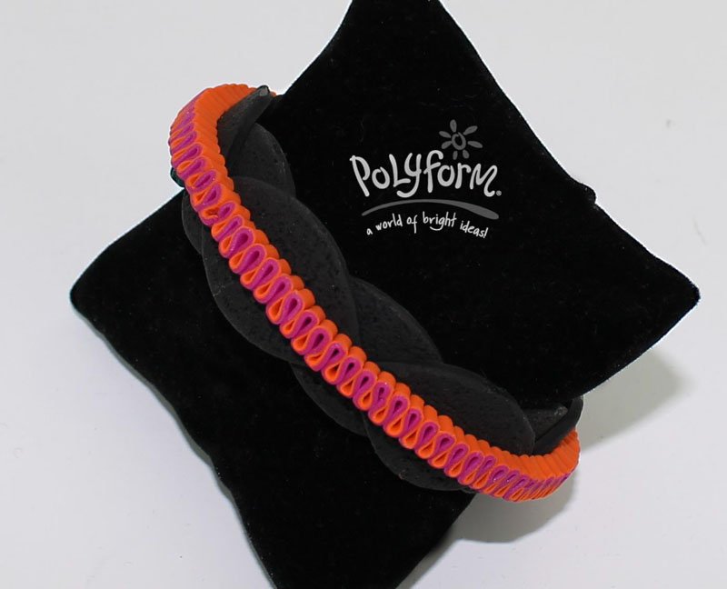 On the # 1 setting of the clay conditioning machine roll out a sheet of Just Orange and Fuchsia, layer them and run through the clay conditioning machine on the # 2 setting and then on setting #4 of the clay conditioning machine. Cut long strips, slightly less than ¼”wide strips and shape them into the wavy pattern. Press them to the bracelet base.