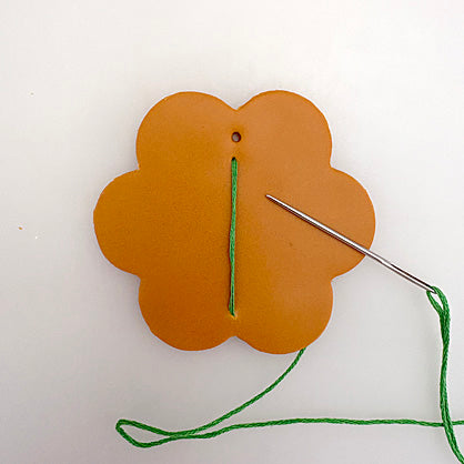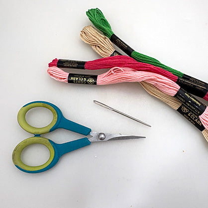 - Embroidery thread in peach, fuschia, tan, and green
