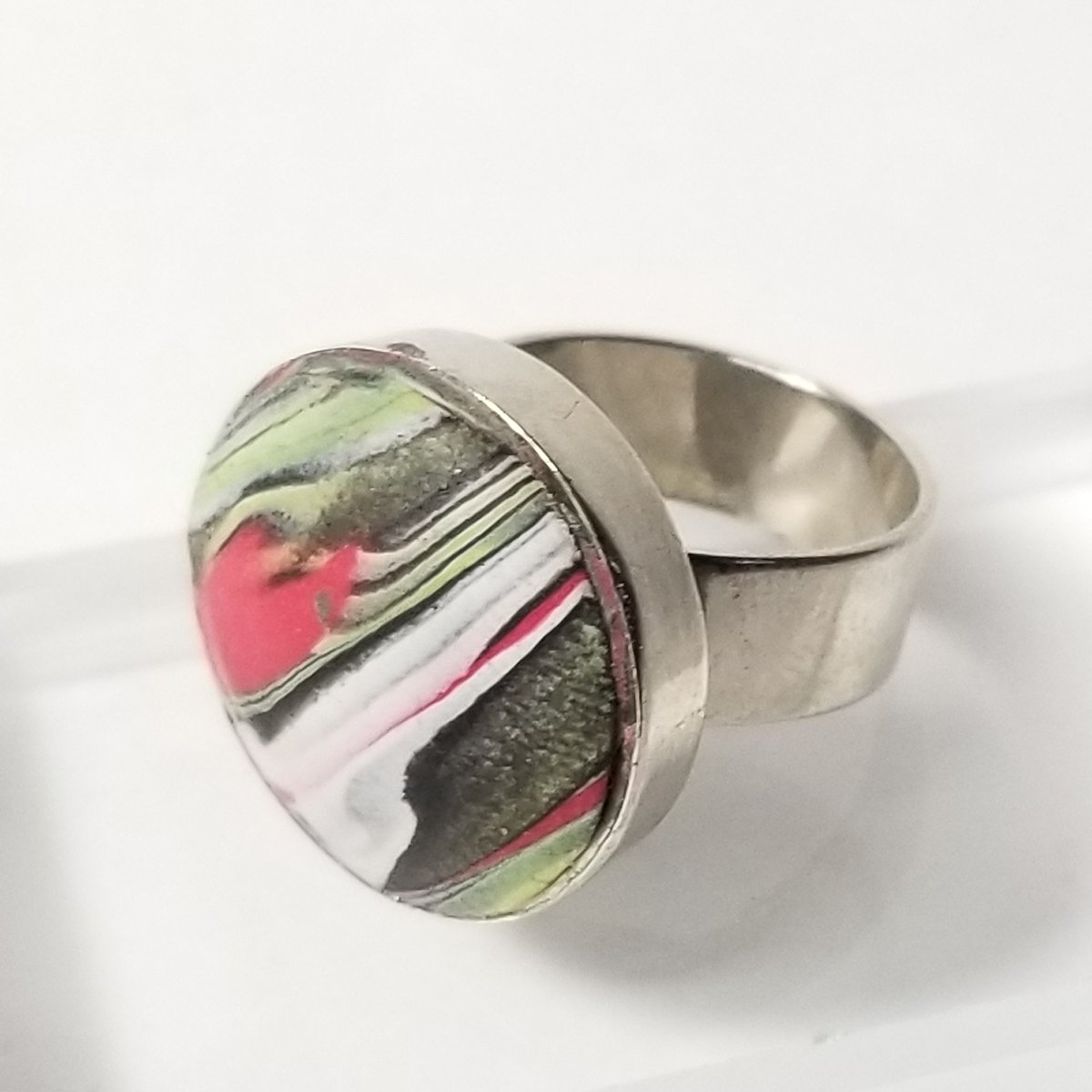 Press the circles into the ring finding and gently press the edges down along the edges of the finding as shown. Souffle clays generally don't fingerprint easily, but if you do notice some slight ridging, use your index finger to gently wipe across the finished surface to remove any fingerprints.
